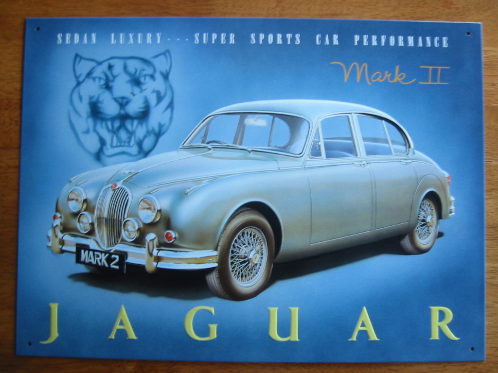 Tin advertising plate of Mk2. Reproduction of 1960's advertising tin plate with embossed car shape. Size about 30x40cm. Story in package told that these were used outside of dealerships before plastic conquered the markets. I bought this from Finnish car museum but originally it comes from UK.