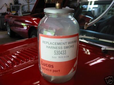 Has your car's wiring harness or other Lucas equipment left the smoke out and not functioning anymore? If yes, you just need to get this replacement Lucas smoke and pump it in! (Was for sale on eBay May 2005)